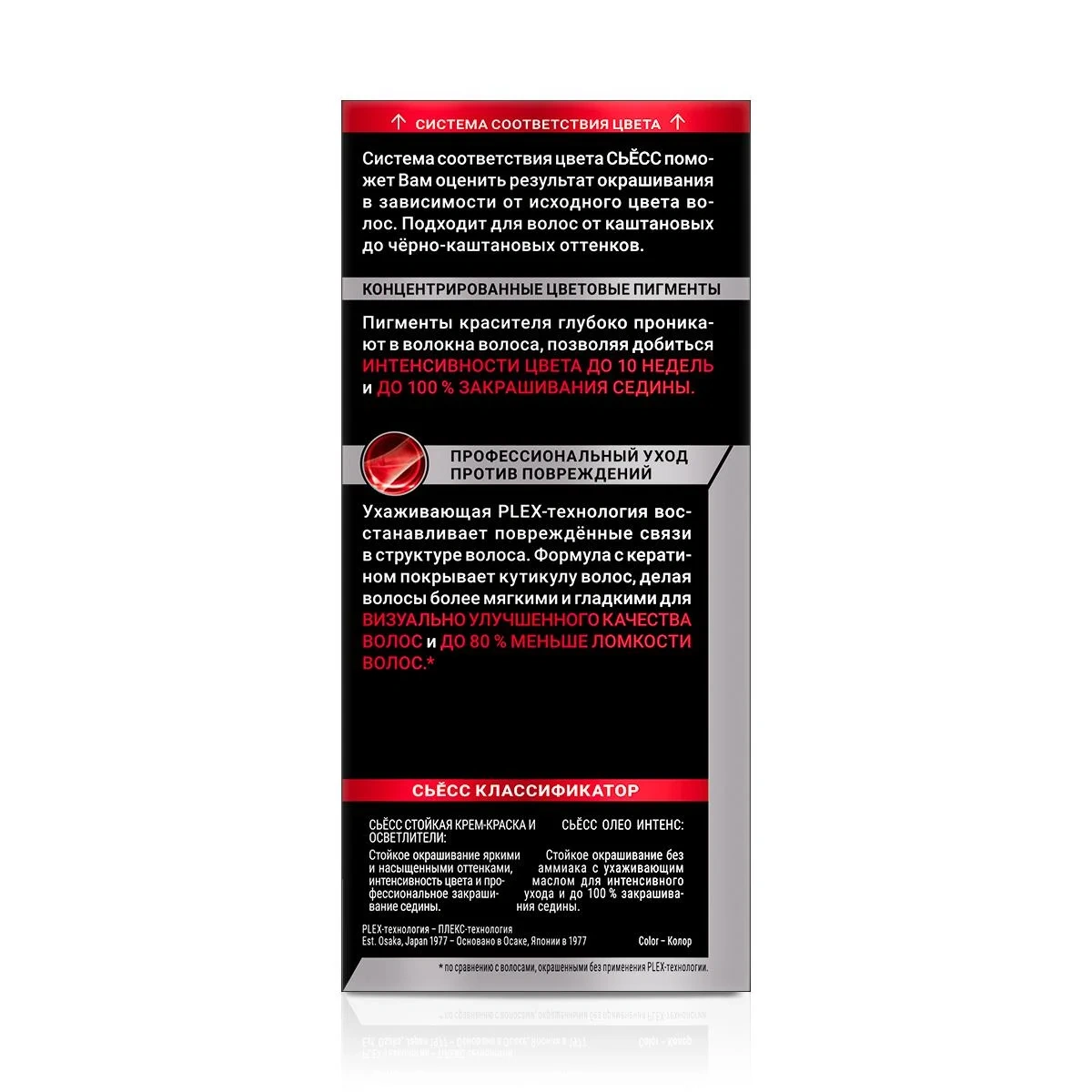 Стойкая крем-краска для волос Сьесс – это профессиональное окрашивание, доступное для использования дома. Концентрированные цветовые пигменты глубоко проникают в волокна волоса, а система против повреждений с ухаживающей PLEX-технологией профессионально восстанавливает структурные связи волоса. Формула с кератином покрывает кутикулу волос, делая их более мягкими и гладкими. До 80% меньше ломкости волос. Интенсивность цвета до 10 недель. До 100% закрашивания седины. Мягкие и гладкие волосы как после салона.