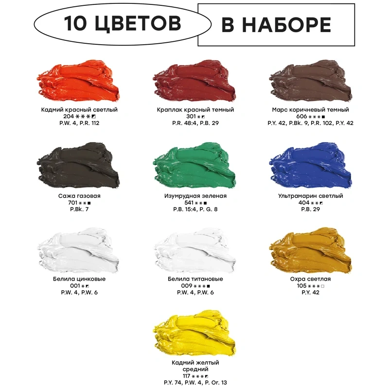 Масляные краски серии «Студия» не уступают тонкотёртым масляным краскам по степени перетира, пастозности и светостойкости. Краски экологически безопасны благодаря имитациям кадмиево-кобальтовой группы пигментов. Они идеальны для начинающих художников и студентов художественных училищ. В набор входят 10 цветов в аллюминиевых тубах (белила цинковые, белила титановые, кадмий жёлтый, кадмий красный, охра светлая, ультрамарин, изумрудный зелёный, краплак красный тёмный, кадмий красный светлый, сажа газовая). Объём одной тубы — 18 мл, общий объём — 180 мл.