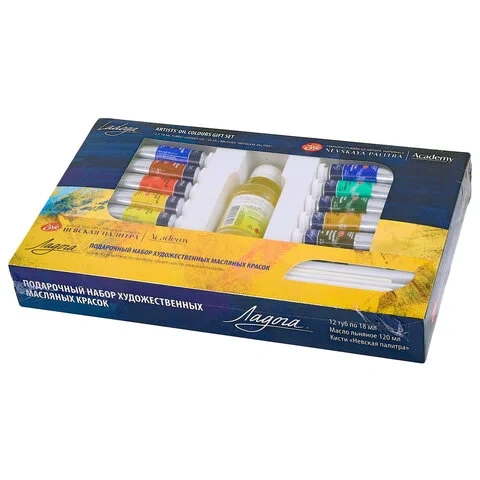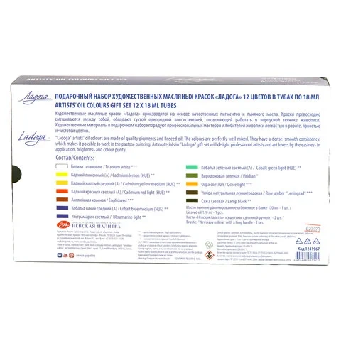 Краски «Ладога» отличаются применением менее дорогих, но не менее стойких (в сравнении с неорганическими), органических пигментов. Характеристики Краски масляные - 12 цветов. Состав набора: белила цинковые или белила титановые, кадмий лимонный (А), кадмий желтый светлый (А) или кадмий желтый средний (А), кадмий красный светлый (А) или кадмий красный темный (А), охра красная или английская красная или индийская красная, кобальт синий средний(А) или голубая«ФЦ» или кобальт синий светлый(А), ультрамарин светлый, кобальт зеленый темный (А) или кобальт зеленый светлый (А), виридоновая зеленая или зеленая «ФЦ», сиена натуральная или охра светлая или охра золотистая, умбра натуральная ленинградская или сиена жженая, сажа газовая или шунгит, масло льняное рафинированное отбеленное 120 мл, кисти 'Невская палитра' щетина длинная ручка плоская №2 и круглая №3. Расфасованы в тубы по 18 мл. 2 кисти. Поставляются в картонной коробке. Артикул производителя: 1241967. Штрих-код: 4690688005525. Производитель: Россия.