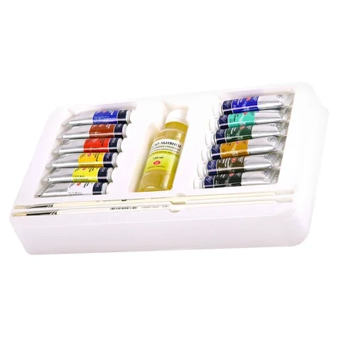 Краска масляная художественная Невская Палитра Ладога 12 цветов по 18мл, масло льняное 120мл, 2 кисти