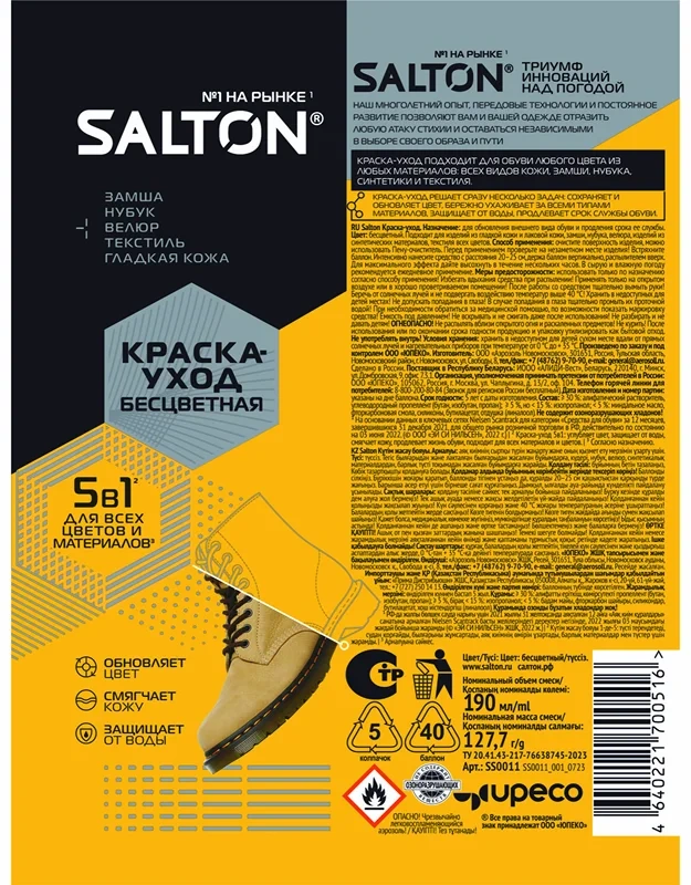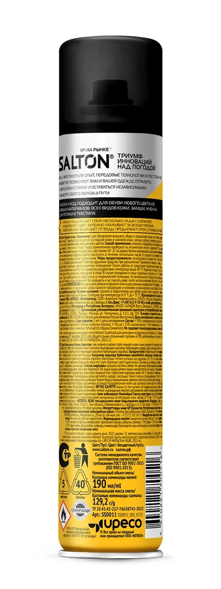 Обувь из нескольких видов материала требует особого ухода. Как правило, специальные средства предназначены для деликатной обработки определенной поверхности. Но те, что подходят для замши, не могут применяться для кожи. А косметика для кожаной обуви может навредить при нанесении на текстиль или замшу. Значит ли это, что при покупке обуви из комбинированных материалов придется приобретать сразу несколько средств? Нет, если Вы выберете Salton. Он идеально подходит для обуви любого цвета из любых материалов: всех видов кожи, замши, нубука, синтетики и текстиля. Salton решает сразу несколько задач: сохраняет и обновляет цвет, бережно ухаживает за кожей, сохраняя свойства других материалов, защищает от воды, продлевает срок службы обуви.