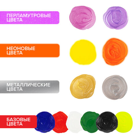 Краски акриловые для рисования и хобби BRAUBERG 12 цветов ассорти по 20 мл (6 базовые + 6 с эффектам