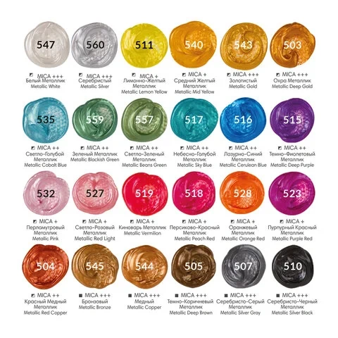 Краски с эффектом 'металлик'. Легко наносятся практически на любую поверхность. Быстрое высыхание без изменения цвета. Отличная укрывистость и светостойкость. Разбавляются водой. Не токсичны и не имеют неприятного резкого запаха. Краски поставляются в тубах объемом 12 мл в картонной коробке.