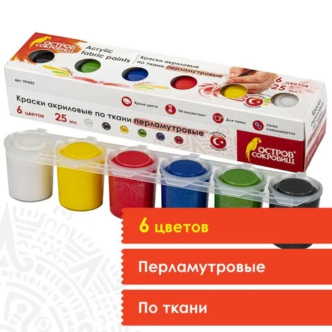 Краски акриловые по ткани ПЕРЛАМУТРОВЫЕ ОСТРОВ СОКРОВИЩ 6 цветов по 25 мл, 191695