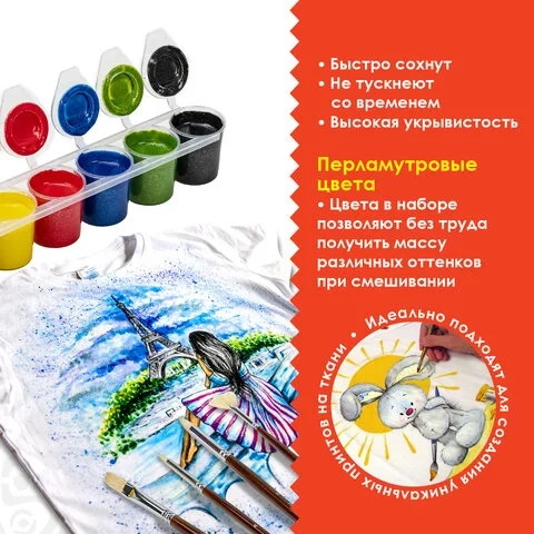 В наборе 6 насыщенных цветов с перламутровым эффектом: белый, черный, желтый, зеленый, красный, синий. Краски обладают высокой кроющей способностью, отлично смешиваются, не тускнеют после высыхания и не выгорают при воздействии солнечных лучей.