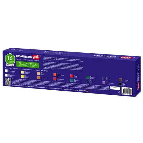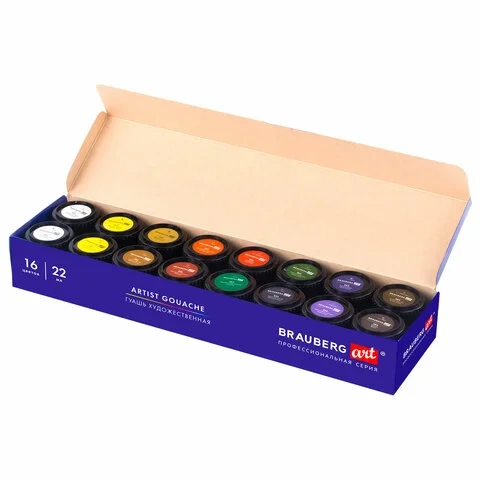 Гуашь художественная BRAUBERG ART CLASSIC, НАБОР 16 цветов в баночках по 22 мл, 191584