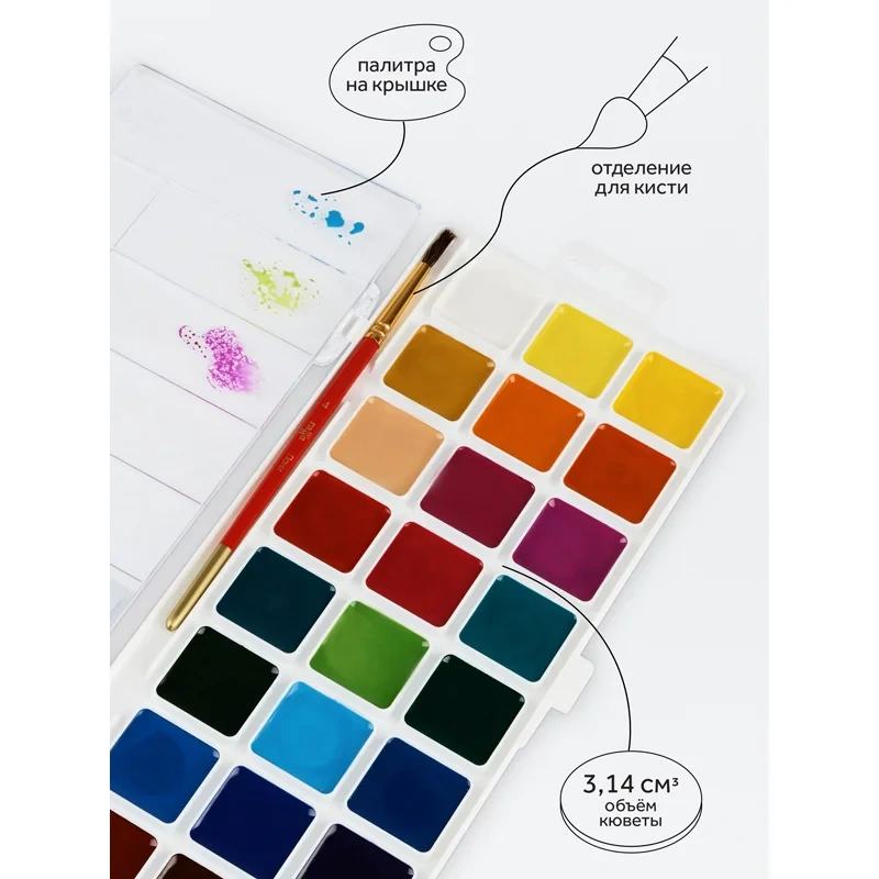 Краски акварельные BRAUBERG KIDS, медовые, 24 цвета, квадратные кюветы, пластиковый пенал, 192284