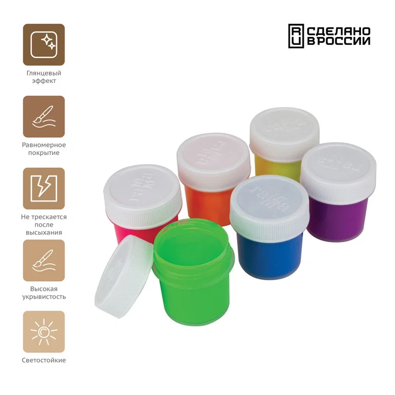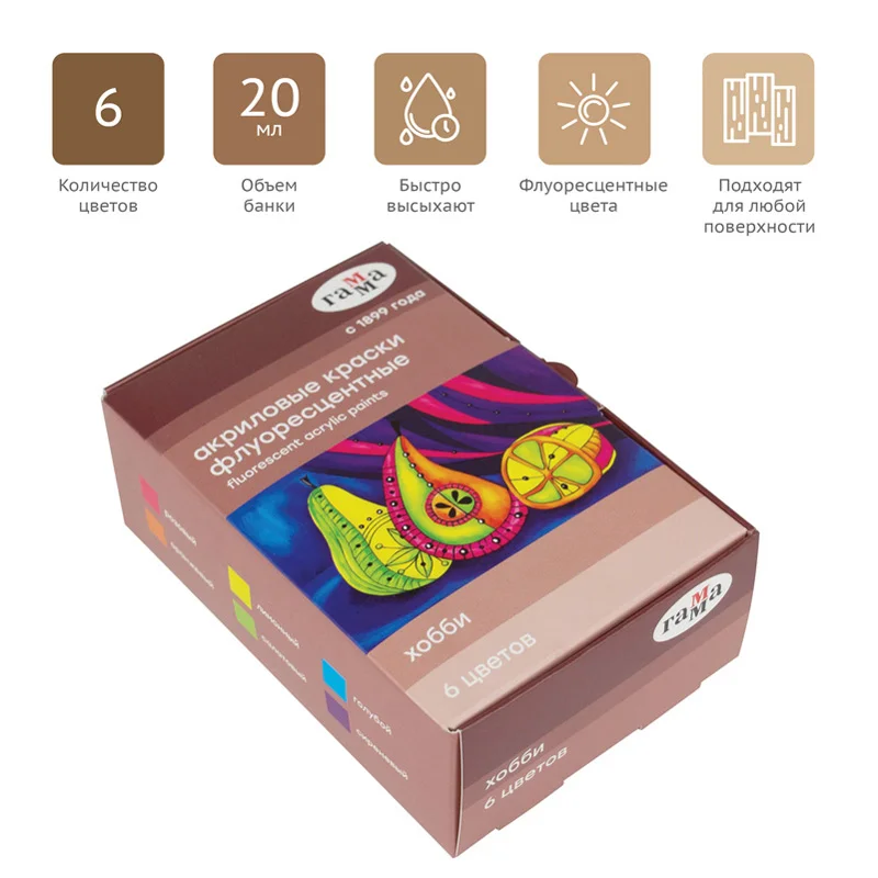 Краски акриловые декоративные Гамма 'Хобби', 06 цветов, 20мл, флуоресц., картон. упаковка