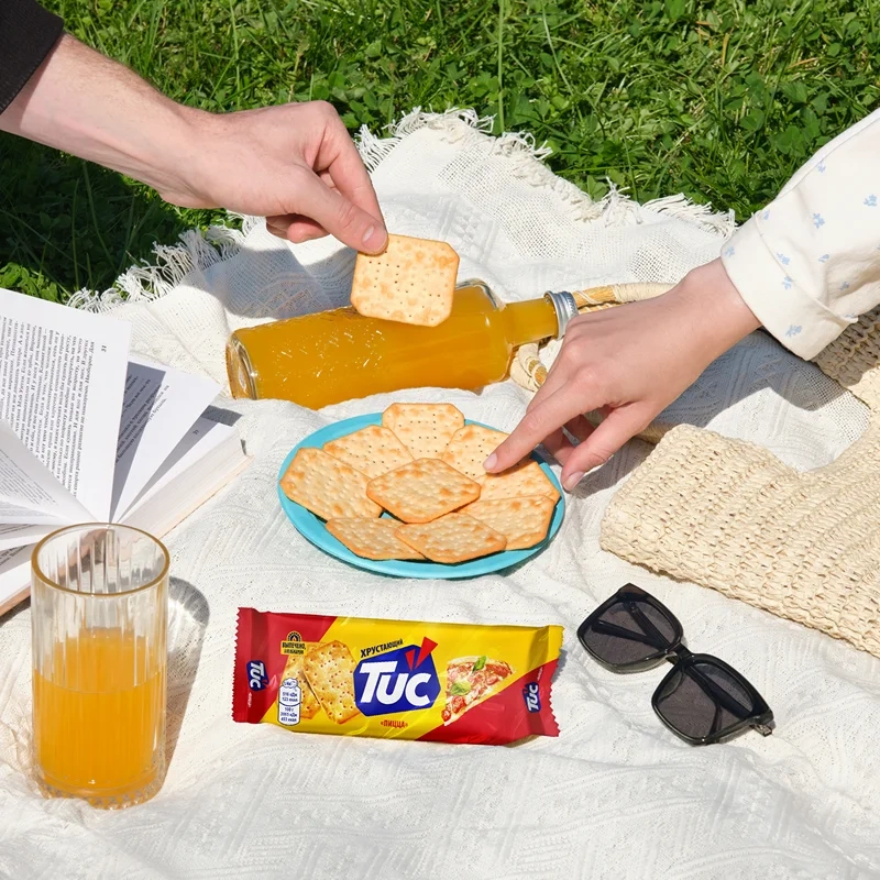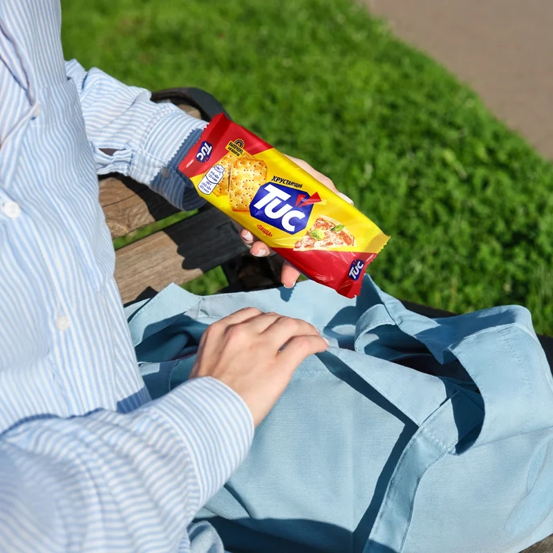 Крекер Tuc со вкусом пиццы 100 г — один из самых популярных вариантов крекеров со вкусом пиццы, который пришелся по душе многочисленным любителям быстрых перекусов на ходу. Тонкое и легкое печенье аппетитно хрустит и моментально тает во рту, оставляя яркое послевкусие выбранного аромата. ТУК — хрустящий крекер со вкусом пиццы — вкусный соленый перекус, который удобно взять с собой в школу или университет, на работу или на прогулку, в поездку или на пикник. Крекер ТУК — идеальная закуска под любимый фильм или сериал, альтернатива чипсам, сухарикам, попкорну, соломке, печенью и выпечке. Он отлично сочетается с соком, газированными напитками, а также с чаем и кофе. Cоздавайте свои собственные рецепты, чтобы удивить близких и гостей, — положите на него ломтик ветчины или сыра, намажьте паштетом или соусом. Состав: мука пшеничная, масла растительные, вода, сироп глюкозно-фруктозный, ароматизатор «Пицца» (вкусоароматические препараты натуральные, сыворотка сухая молочная, усилители вкуса и аромата (Е621, Е631, Е627), вкусоароматические вещества натуральные, вкусоароматические вещества, вещество для обработки муки (хлорид аммония), агенты антислеживающие (диоксид кремния аморфный, фосфаты кальция), регулятор кислотности (кислота лимонная)), продукт яичный, разрыхлители (гидрокарбонат аммония, гидрокарбонат натрия), соль, консервант (пиросульфит натрия). Содержит молочные продукты, пшеницу, глютен, яйца, сульфаты. Может содержать следы сои и кунжута. Вес: 100 г. Тип упаковки: мягкая. Страна производства: Россия. Срок хранения: 9 месяцев. ТУ 9132-009-40449419.
