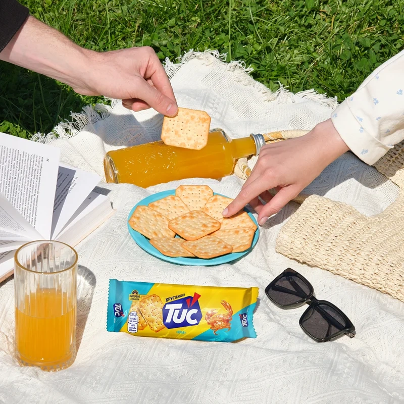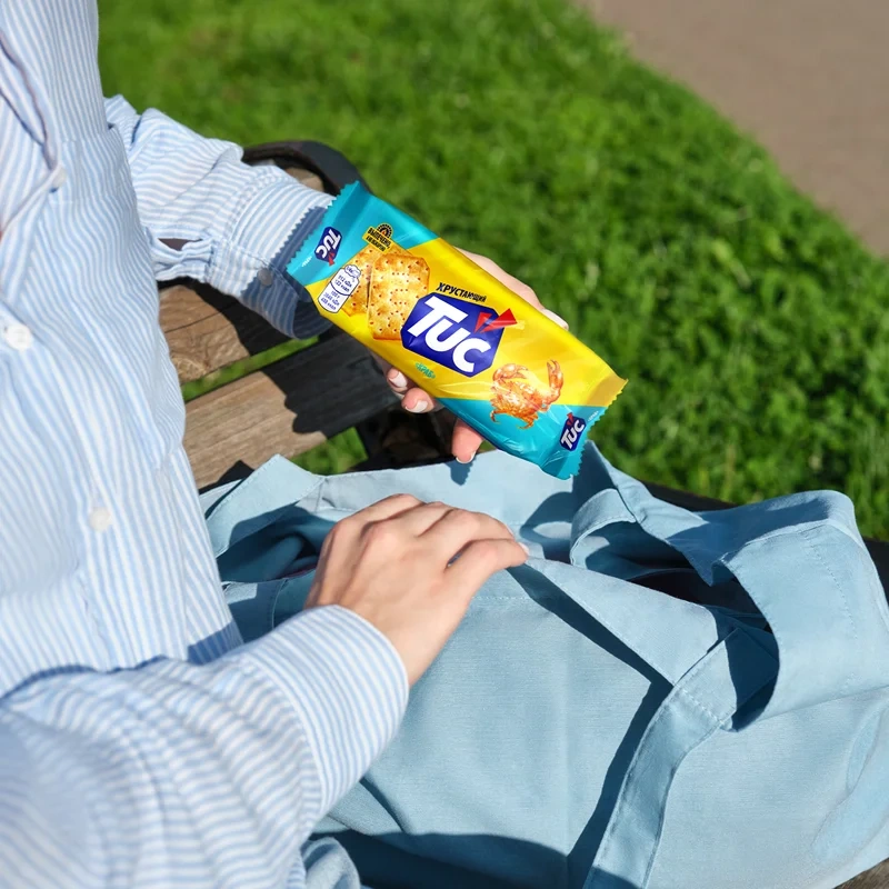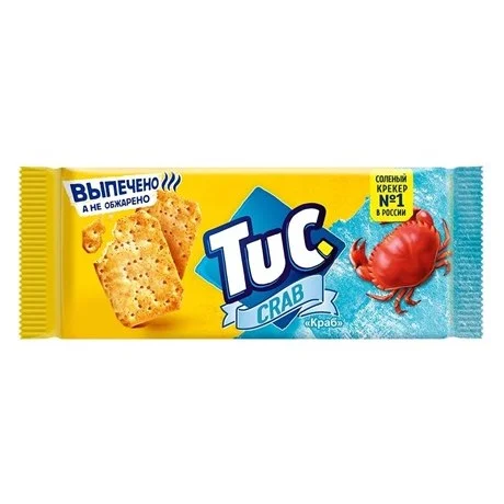Крекеры Tuc со вкусом краба — это снеки с уникальной хрустающей текстурой и насыщенным вкусом любимого многими деликатеса — краба. Крекеры Tuc изготавливаются по оригинальному рецепту: они выпекаются, а не обжариваются, поэтому так аппетитно хрустят, тают во рту и раскрывают свой вкус плавно, но ярко! Снеки Tuc — это отличный вариант перекуса на учебу, работу или в дорогу. Крекер в компактной упаковке не занимает много места, поэтому его можно взять с собой куда угодно, или с удовольствием похрустеть им дома за просмотром любимого сериала. Крекеры Tuc — удачная альтернатива печенью, чипсам или выпечке: они сочетаются с соком, газированными напитками, водой, подходят к чаю или кофе. А если проявить немного кулинарной фантазии, и добавить к этим крекерам немного соуса, паштета, зелени, кусочек сыра или ветчины — из них получатся отличные мини-закуски, которыми можно удивить друзей на вечеринке. Ищете вкусный, легкий и быстрый перекус для себя и близких? Тогда крекеры Tuc со вкусом краба — именно то, что вам нужно! Попробуй Tuc — расхрусти веселье!