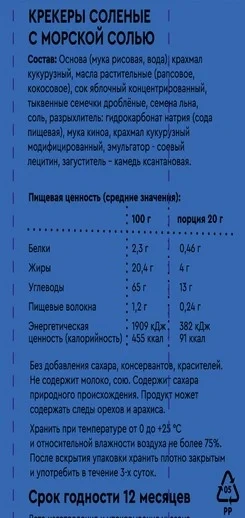 Крекеры Bite Picnic - идеальный вариант перекуса на ходу, ведь они не содержат добавленный сахар, глютен, искусственные ароматизаторы и консерванты! Хрустите с пользой! Крекеры обладают сертификатам Перечёркнутый колос - без глютена, подходят веганам и вегетарианцам. Это полезный перекус в удобном формате, чтобы взять с собой на пикник, на учебу или работу. Рецептура позволяет бережно выпекать крекеры без использования масла, делая их хрустящими, а хрустящие семена тыквы и льна придают им необычную текстуру и яркий вкус! Самое главное - это настоящее спасение для тех, кто следит за своей фигурой, потому что в 1 порции всего 90 ккал. В крекерах нет белой муки и добавленного сахара! Только максимум пользы и вкуса. Подходят людям с непереносимостью глютена. Продукт подходит веганам и вегетарианцам.