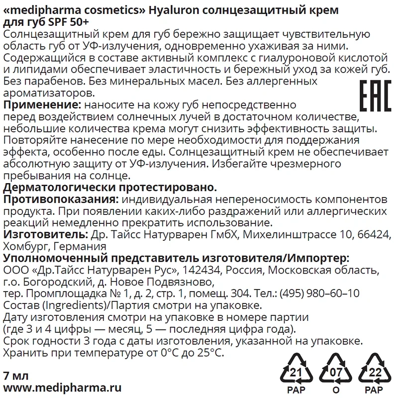 Крем для губ Medipharma Cosmetics Hyaluron солнцезащитный SPF50+, 7мл