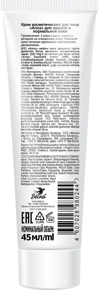 Утром и вечером наносите необходимое количество крема на очищенную и протонизированную кожу лица и шеи.Состав