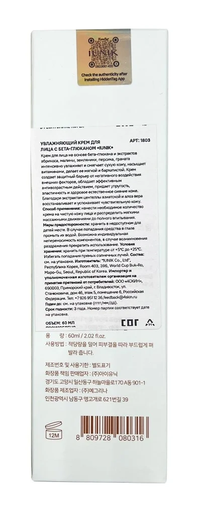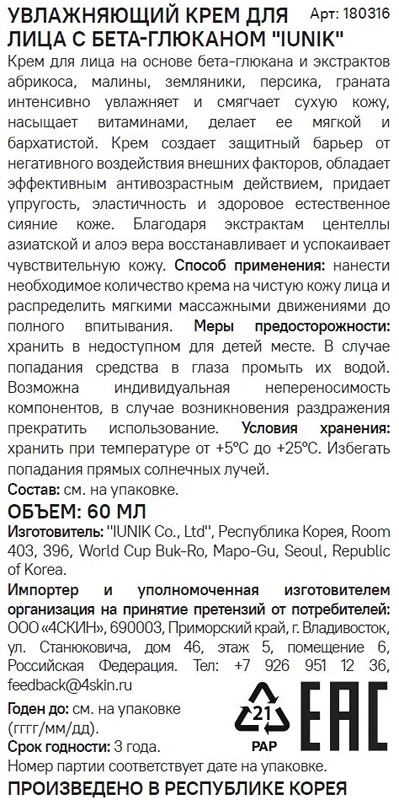 Крем для лица Iunik увлажняющий бета-глюкан, 60мл
