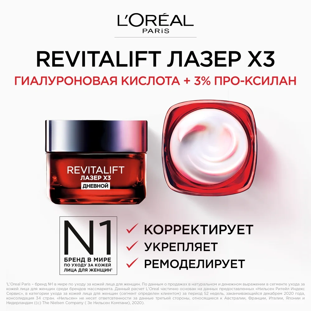 Лореаль Париж разработал антивозрастной крем для лица Revitalift Лазер х3, который оказывает тройной эффект благодаря активным веществам в составе: фрагментированная гиалуроновая кислота разглаживает морщины, 3% Про-Ксилан повышает упругость кожи, стимулирует её обновление и восстанавливает контуры. При регулярном использовании текстура и тон кожи выравниваются, заметно сокращаются морщины.