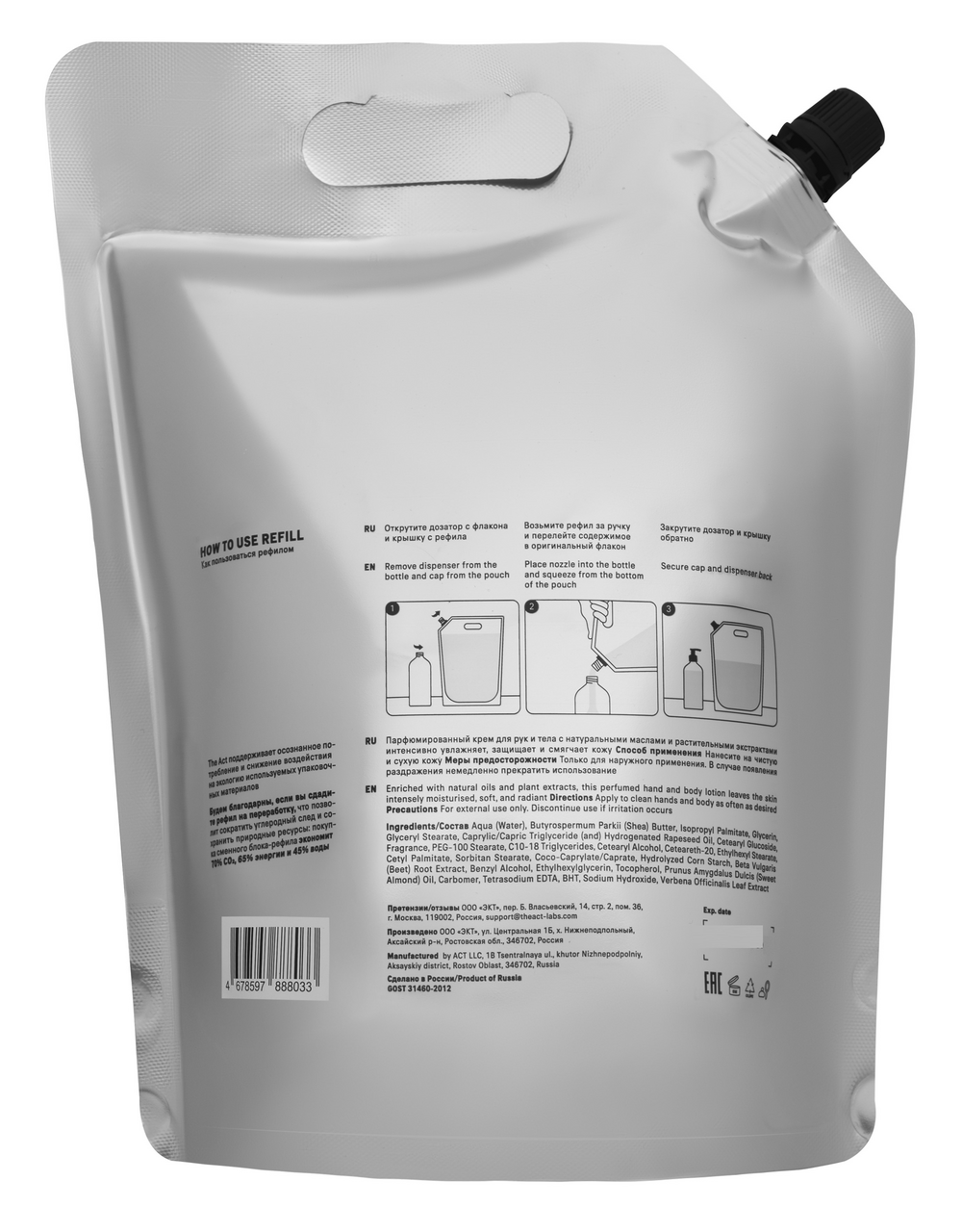 Питательный крем с натуральными экстрактами интенсивно увлажняет и смягчает кожу рук и тела, предупреждает шелушение и раздражение, успокаивает и восстанавливает эластичность кожи. Многослойный аромат вербены создает ощущение неспешной прогулки под сенью цитрусовых деревьев и едва уловимого дуновения ветра с полей лаванды и мяты. Это универсальный питательный уход на основе натуральных компонентов для увлажнения и смягчения кожи всего тела. Французская парфюмированная отдушка с легким цитрусовым ароматом подходит и женщинам, и мужчинам. Формула крема содержит компоненты растительного происхождения и глицерин, который обладает высокой гигроскопичностью и притягивает влагу к поверхности кожи, устраняя сухость, стянутость и дискомфорт. Лимонная кислота имеет антибактериальное действие, оптимизирует рН-баланс и создает тонкую пленочку, которая защищает от чрезмерного испарения влаги, что важно для сухой кожи и после горячей ванны или душа или долгого пребывания на солнце или морозе. Комплекс из масел ши, рапсового и миндального увлажняет, устраняет сухость и шелушение, укрепляет защитные свойства кожи и восстанавливает липидный барьер после агрессивного воздействия внешних факторов. Вербена повышает упругость кожи, тонизирует и смягчает, обладает противовоспалительными и антисептическими свойствами. Экстракт свеклы оказывает увлажняющее и антиоксидантное действия. Парфюмированный крем для рук тела женский имеет густую текстуру, хорошо впитывается и оставляет на теле невесомый флюид для пролонгированного увлажнения. Удобный дозатор помогает отрегулировать нужный объем средства. Крем восстанавливает липидный барьер, смягчает и питает кожу, делая ее гладкой и бархатистой. Парфюмированная отдушка с ароматом цитрусовой вербены держится на коже, приятно освежает и создает настроение курортного отдыха на берегу моря. Наносите на чистую и сухую кожу рук и тела, когда требуется увлажнение. Подходит для любого типа кожи. Рекомендован к применению с 14 лет.