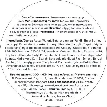 Питательный крем с натуральными экстрактами интенсивно увлажняет и смягчает кожу рук и тела, предупреждает шелушение и раздражение, успокаивает и восстанавливает эластичность кожи. Многослойный аромат вербены создает ощущение неспешной прогулки под сенью цитрусовых деревьев и едва уловимого дуновения ветра с полей лаванды и мяты. Это универсальный питательный уход на основе натуральных компонентов для увлажнения и смягчения кожи всего тела. Французская парфюмированная отдушка с легким цитрусовым ароматом подходит и женщинам, и мужчинам. Формула крема содержит компоненты растительного происхождения и глицерин, который обладает высокой гигроскопичностью и притягивает влагу к поверхности кожи, устраняя сухость, стянутость и дискомфорт. Лимонная кислота имеет антибактериальное действие, оптимизирует рН-баланс и создает тонкую пленочку, которая защищает от чрезмерного испарения влаги, что важно для сухой кожи и после горячей ванны или душа или долгого пребывания на солнце или морозе. Комплекс из масел ши, рапсового и миндального увлажняет, устраняет сухость и шелушение, укрепляет защитные свойства кожи и восстанавливает липидный барьер после агрессивного воздействия внешних факторов. Вербена повышает упругость кожи, тонизирует и смягчает, обладает противовоспалительными и антисептическими свойствами. Экстракт свеклы оказывает увлажняющее и антиоксидантное действия. Парфюмированный крем для рук тела женский имеет густую текстуру, хорошо впитывается и оставляет на теле невесомый флюид для пролонгированного увлажнения. Удобный дозатор помогает отрегулировать нужный объем средства. Крем восстанавливает липидный барьер, смягчает и питает кожу, делая ее гладкой и бархатистой. Парфюмированная отдушка с ароматом цитрусовой вербены держится на коже, приятно освежает и создает настроение курортного отдыха на берегу моря. Наносите на чистую и сухую кожу рук и тела, когда требуется увлажнение. Подходит для любого типа кожи. Рекомендован к применению с 14 лет.