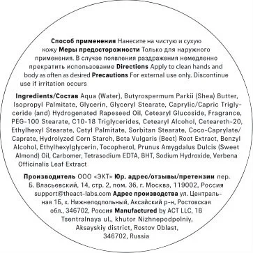| Масла и экстракты | миндальное масло; экстракт вербены; экстракт свеклы; масло ши (карите) |