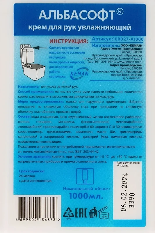 Крем для рук в картридже Keman Альбасофт для S1, 1л, увлажняющий, 100027-А1000