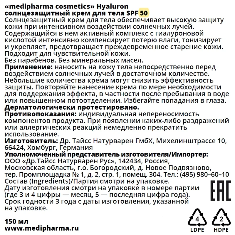 Крем для тела Medipharma Cosmetics Hyaluron солнцезащитный SPF50, 150мл