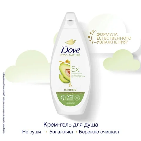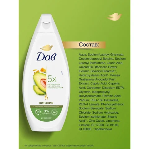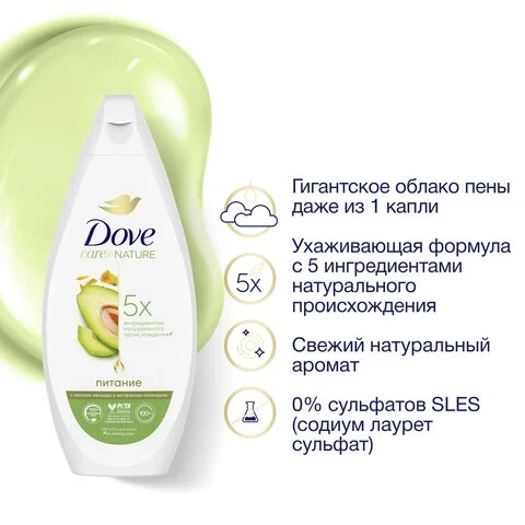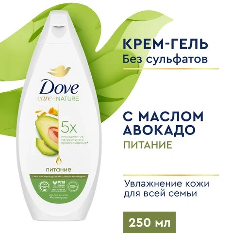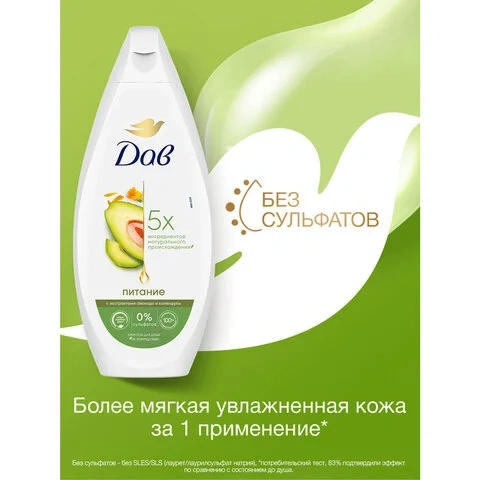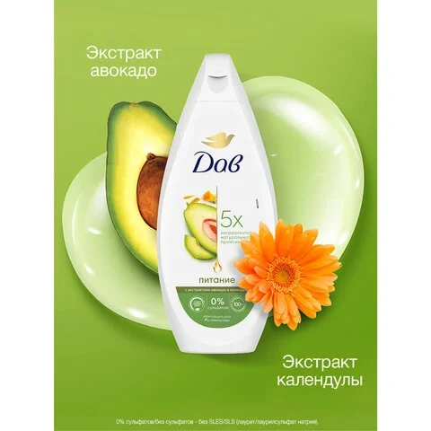 Бессульфатный крем-гель для душа Дав 'Масло авокадо и экстракт календулы' - это уходовое средство, которое мгновенно дарит коже естественное длительное питание.