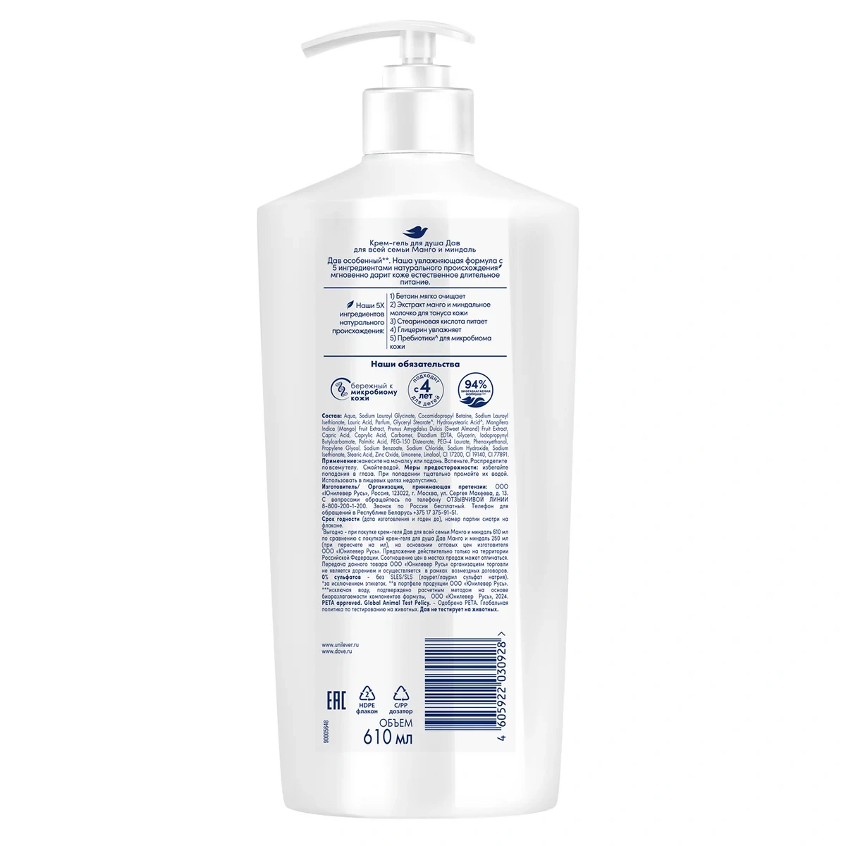Крем-гель для душа Дав Манго и миндаль, 610мл
