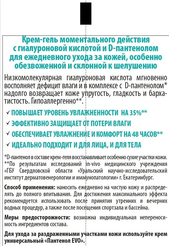 Крем-гель моментального действия с гиалуроновой кислотой и D-пантенолом для ежедневного ухода за кожей, особенно обезвоженной и склонной к шелушению. Низкомолекулярная гиалуроновая кислота мгновенно восполняет дефицит влаги и в комплексе с D-пантенолом надолго возвращает коже упругость, гладкость и бархатистость. Рекомендован к применению после утренних и вечерних водных процедур, а также после посещения спортзала и бассейна. Средство моментального действия c гиалуроновой кислотой и D-пантенолом для ежедневного ухода за кожей, особенно обезвоженной и склонной к шелушению. Низкомолекулярная гиалуроновая кислота мгновенно восполняет дефицит влаги и в комплексе с D-пантенолом надолго возвращает коже упругость, гладкость и бархатистость. Гипоаллергенно. Повышает уровень увлажненности на 35% эффективно защищает от потери влаги увлажнение и комфорт на 48 часов. Прекрасно подходит и для лица, и для тела.