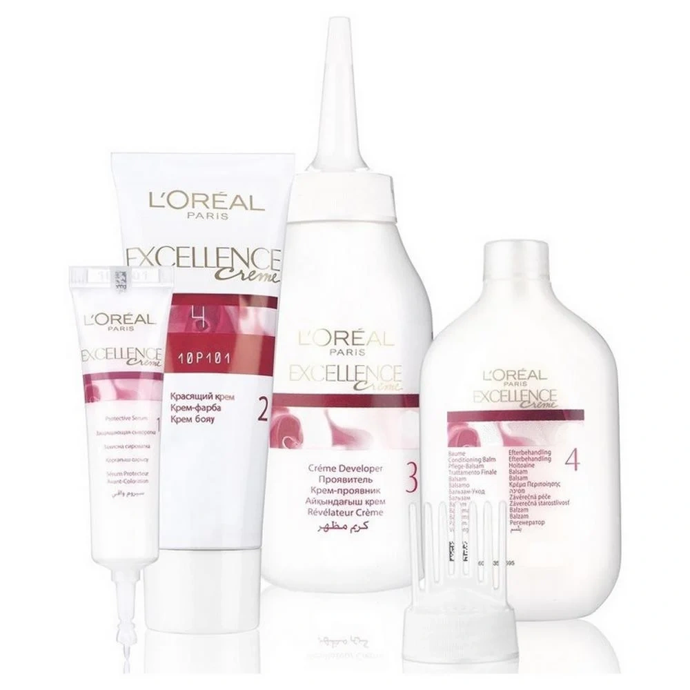 Крем-краска для волос L'Oreal Paris Excellence creme – это уход за цветом, кожей головы и преимущество - это про-кератин и сыворотка, защищающая во время окрашивания. Стойкость цвета и 100% закрашивания седины. Прекрасно подходит для использования в домашних условиях. Краску легко наносить самостоятельно при помощи специальной бутылочки, снабженной насадкой в виде расчески.