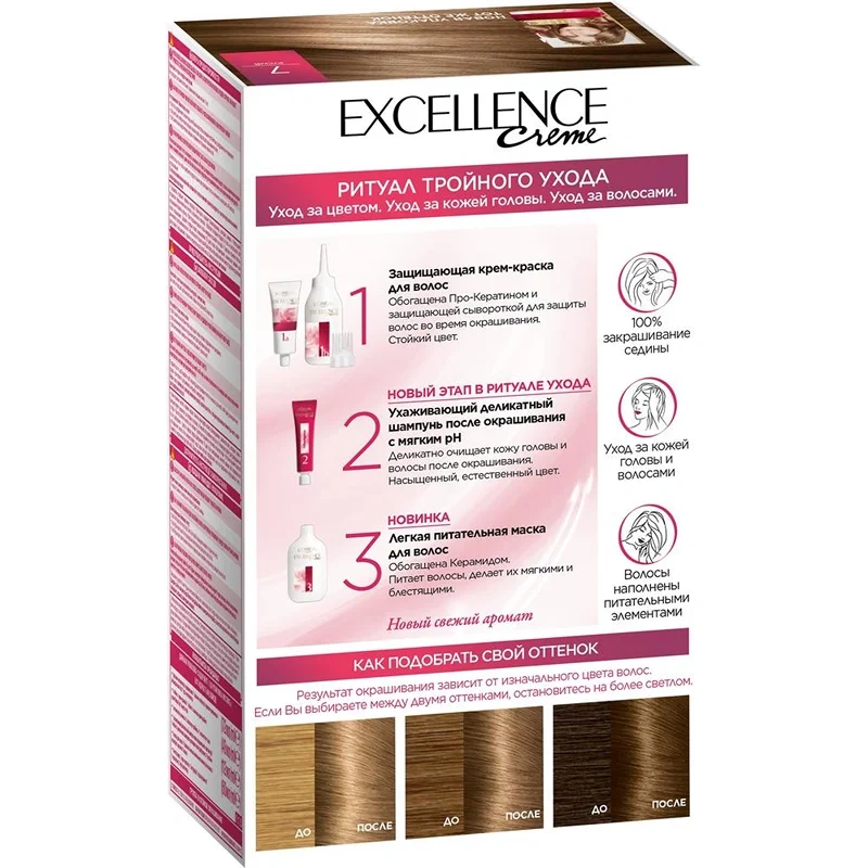 Крем-краска для волос L'Oreal Paris Excellence creme – это уход за цветом, кожей головы и преимущество - это про-кератин и сыворотка, защищающая во время окрашивания. Стойкость цвета и 100% закрашивания седины. Прекрасно подходит для использования в домашних условиях. Краску легко наносить самостоятельно при помощи специальной бутылочки, снабженной насадкой в виде расчески.