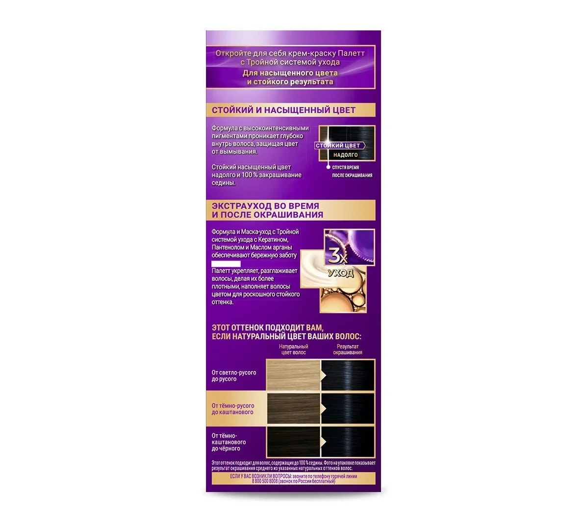 Благодаря тройной системе ухода стойкая крем-краска для волос Палетт обеспечивает бережное окрашивание. С аммиаком. Комплекс с Кератином, Пантенолом и Аргановым маслом проникает глубоко в структуру волоса, восстанавливая, увлажняя и питая его изнутри. Активные вещества оказывают смягчающее и укрепляющее воздействие, делая волосы гладкими и блестящими. Формула с высокоинтенсивными пигментами придает волосам насыщенный цвет и защищает его от вымывания. До 100% без седины. Надолго!