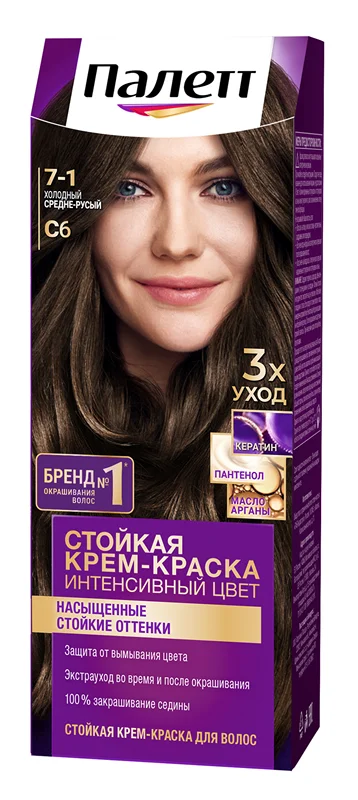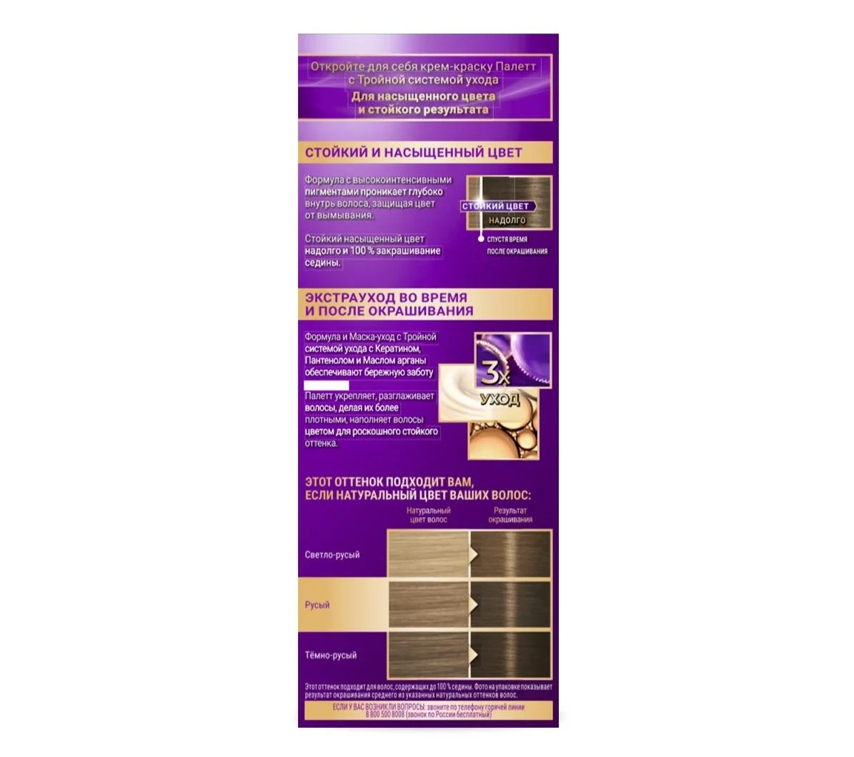 Благодаря тройной системе ухода стойкая крем-краска для волос Палетт обеспечивает бережное окрашивание. С аммиаком. Комплекс с Кератином, Пантенолом и Аргановым маслом проникает глубоко в структуру волоса, восстанавливая, увлажняя и питая его изнутри. Активные вещества оказывают смягчающее и укрепляющее воздействие, делая волосы гладкими и блестящими. Формула с высокоинтенсивными пигментами придает волосам насыщенный цвет и защищает его от вымывания. До 100% без седины. Надолго!