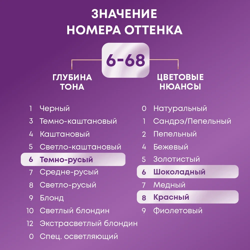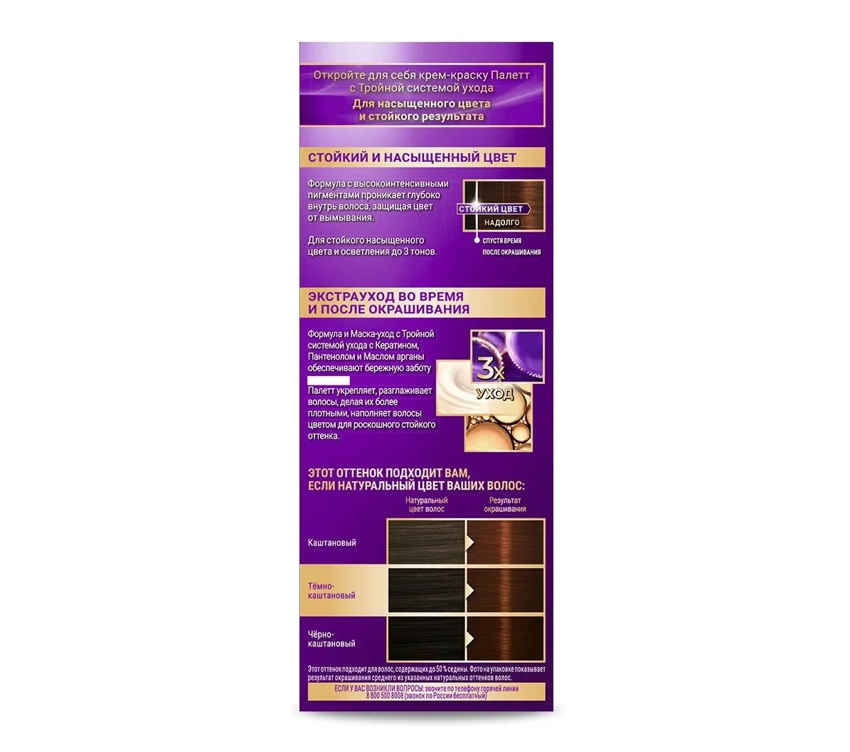 Благодаря тройной системе ухода стойкая крем-краска для волос Палетт обеспечивает бережное окрашивание. С аммиаком. Комплекс с Кератином, Пантенолом и Аргановым маслом проникает глубоко в структуру волоса, восстанавливая, увлажняя и питая его изнутри. Активные вещества оказывают смягчающее и укрепляющее воздействие, делая волосы гладкими и блестящими. Формула с высокоинтенсивными пигментами придает волосам насыщенный цвет и защищает его от вымывания. До 100% без седины. Надолго!