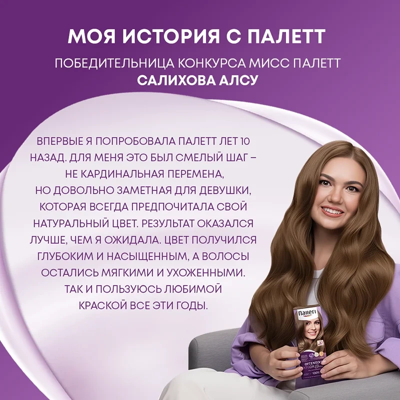 Благодаря тройной системе ухода стойкая крем-краска для волос Палетт обеспечивает бережное окрашивание. С аммиаком. Комплекс с Кератином, Пантенолом и Аргановым маслом проникает глубоко в структуру волоса, восстанавливая, увлажняя и питая его изнутри. Активные вещества оказывают смягчающее и укрепляющее воздействие, делая волосы гладкими и блестящими. Формула с высокоинтенсивными пигментами придает волосам насыщенный цвет и защищает его от вымывания. До 100% без седины. Надолго!
