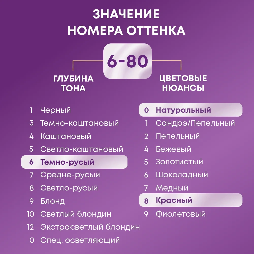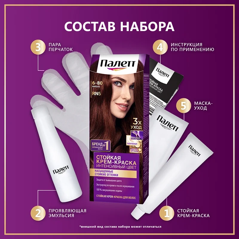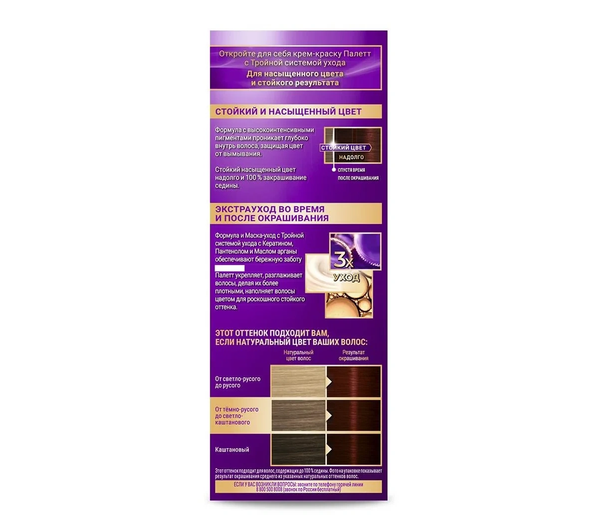 Благодаря тройной системе ухода стойкая крем-краска для волос Палетт обеспечивает бережное окрашивание. С аммиаком. Комплекс с Кератином, Пантенолом и Аргановым маслом проникает глубоко в структуру волоса, восстанавливая, увлажняя и питая его изнутри. Активные вещества оказывают смягчающее и укрепляющее воздействие, делая волосы гладкими и блестящими. Формула с высокоинтенсивными пигментами придает волосам насыщенный цвет и защищает его от вымывания. До 100% без седины. Надолго!