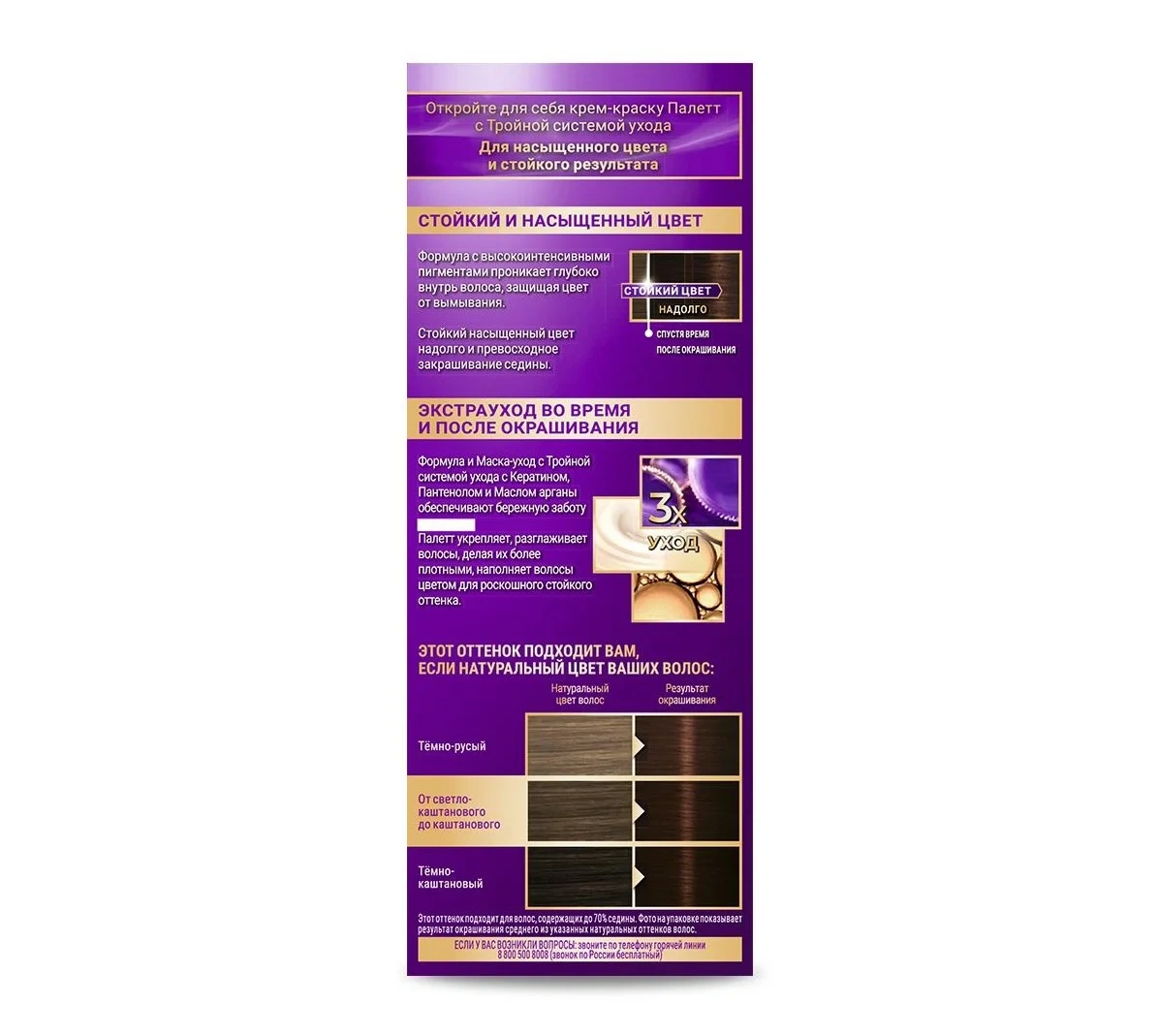 Благодаря тройной системе ухода стойкая крем-краска для волос Палетт обеспечивает бережное окрашивание. С аммиаком. Комплекс с Кератином, Пантенолом и Аргановым маслом проникает глубоко в структуру волоса, восстанавливая, увлажняя и питая его изнутри. Активные вещества оказывают смягчающее и укрепляющее воздействие, делая волосы гладкими и блестящими. Формула с высокоинтенсивными пигментами придает волосам насыщенный цвет и защищает его от вымывания. До 100% без седины. Надолго!