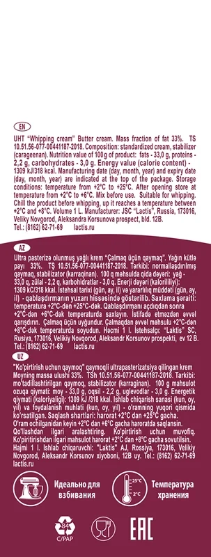 Крем сливочный ультрапастеризованный Сливки для взбивания Lactica, 33% идеально подходит для приготовления и украшения выпечки и десертов с использованием взбитых сливок. Перед употреблением продукт следует охладить в течение нескольких часов в холодильнике, тогда сливки взобьются легко и быстро, образуя воздушную сливочную массу (температура для получения наилучшего результата 4С). Сливки для взбивания, Lactica, 33% хорошо держат форму, обладают приятным вкусом и ароматом. Для максимального удобства использования и хранения продукта упаковка снабжена завинчивающейся крышкой.