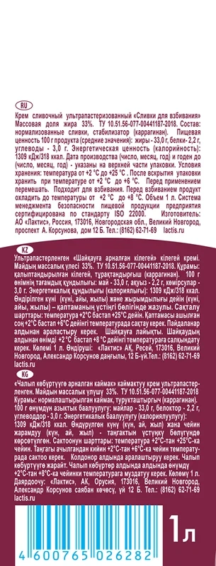 Крем Lactica ультрапастеризованный сливочный для взбивания 33%, 1л