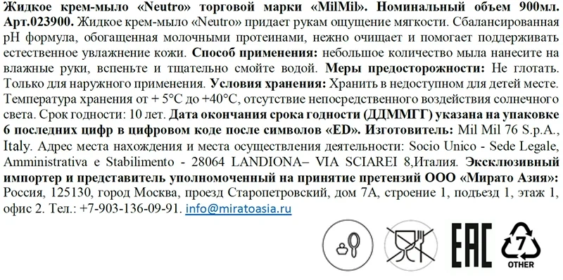 Крем-мыло жидкое Milmil Neutro, 900мл