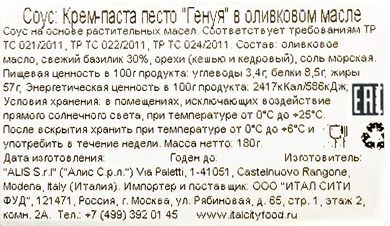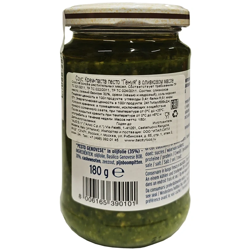 Самый популярный из итальянских соусов. Крем-паста соус песто Генуя. Вкусно с любыми макаронами, с сыром, с томатами, с рыбой, с мясом, с крекером. Используют для приготовления пасты, а также супов, лазаньи или же как намазку для крекеров и хлеба. Соус песто - король итальянских соусов. Его рецепт, известный еще во время Римской империи, берет свои корни в Генуе, поэтому классическим считается pesto alla Genovese. Песто имеет специфический зеленый цвет, но также существует разновидность красного соуса с вялеными на солнце томатами. Классический песто изготавливают из базилика с добавлением соли, чеснока, оливкового или подсолнечного масла и сыра Пармезан. Добавка трюфелей придает песто пикантный вкус и непередаваемый аромат, который удовлетворит любого, самого взыскательного гурмана. Соус богат клетчаткой, полиненасыщенными жирными кислотами Омега 3, магнием и витаминами группы B. Сохранить его полезные питательные свойства позволяет тот факт, что при приготовлении песто не подвергается тепловой обработке.