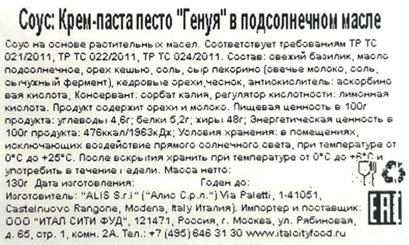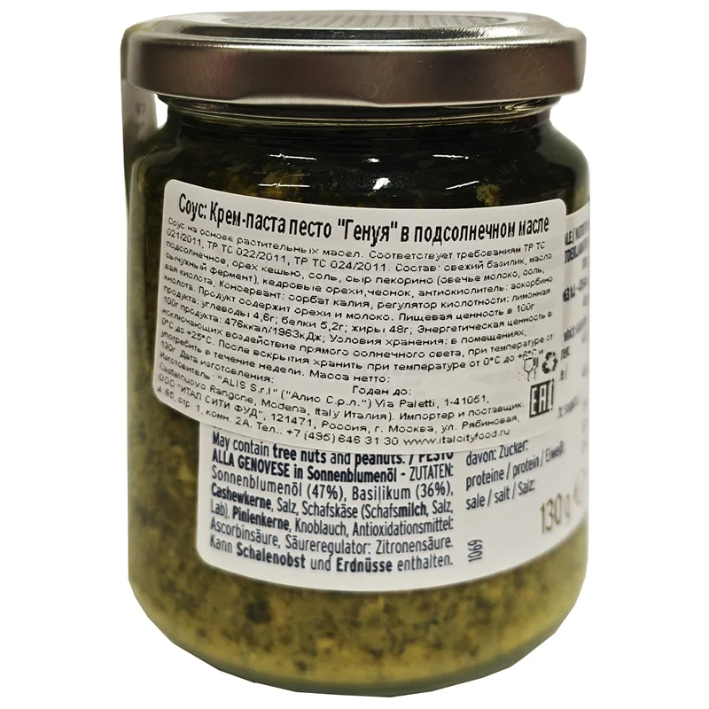 Самый популярный из итальянских соусов. Крем-паста соус песто Генуя. Вкусно с любыми макаронами, с сыром, с томатами, с рыбой, с мясом, с крекером. Используют для приготовления пасты, а также супов, лазаньи или же как намазку для крекеров и хлеба. Соус песто - король итальянских соусов. Его рецепт, известный еще во время Римской империи, берет свои корни в Генуе, поэтому классическим считается pesto alla Genovese. Песто имеет специфический зеленый цвет, но также существует разновидность красного соуса с вялеными на солнце томатами. Классический песто изготавливают из базилика с добавлением соли, чеснока, оливкового или подсолнечного масла и сыра Пармезан. Добавка трюфелей придает песто пикантный вкус и непередаваемый аромат, который удовлетворит любого, самого взыскательного гурмана. Соус богат клетчаткой, полиненасыщенными жирными кислотами Омега 3, магнием и витаминами группы B. Сохранить его полезные питательные свойства позволяет тот факт, что при приготовлении песто не подвергается тепловой обработке.