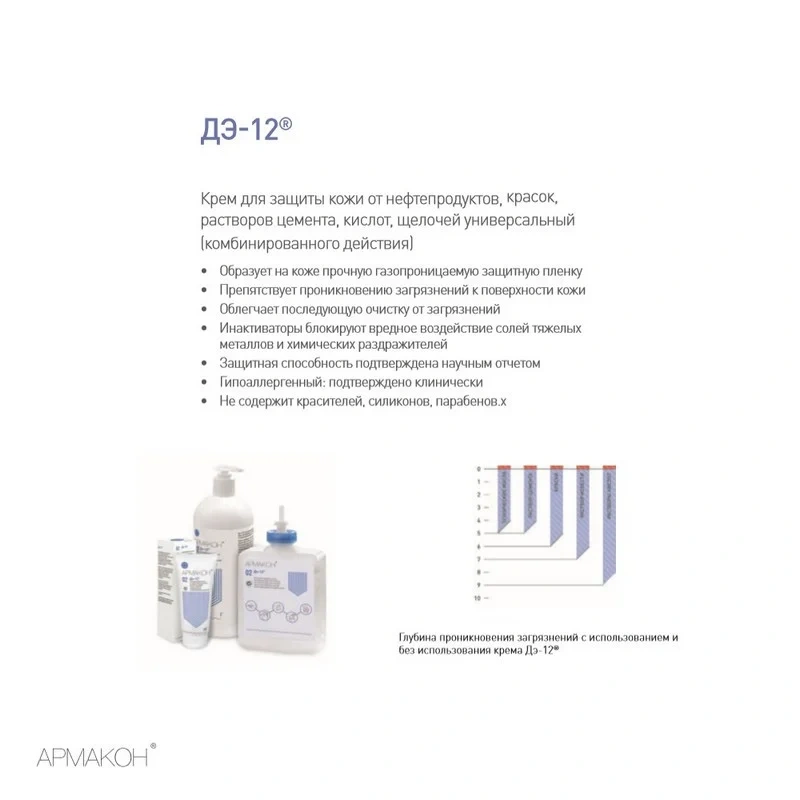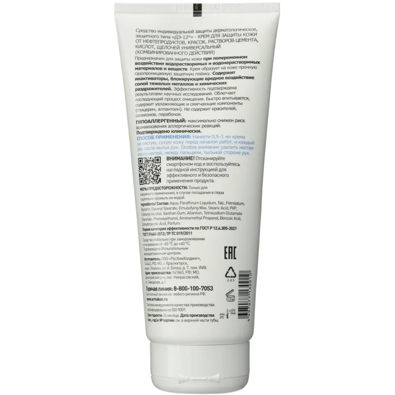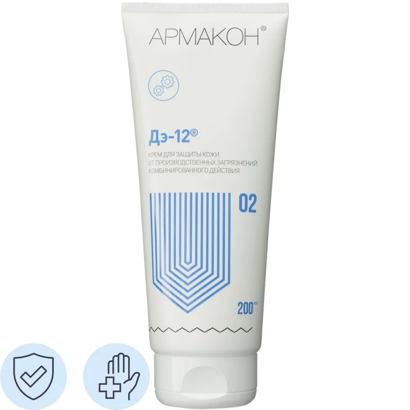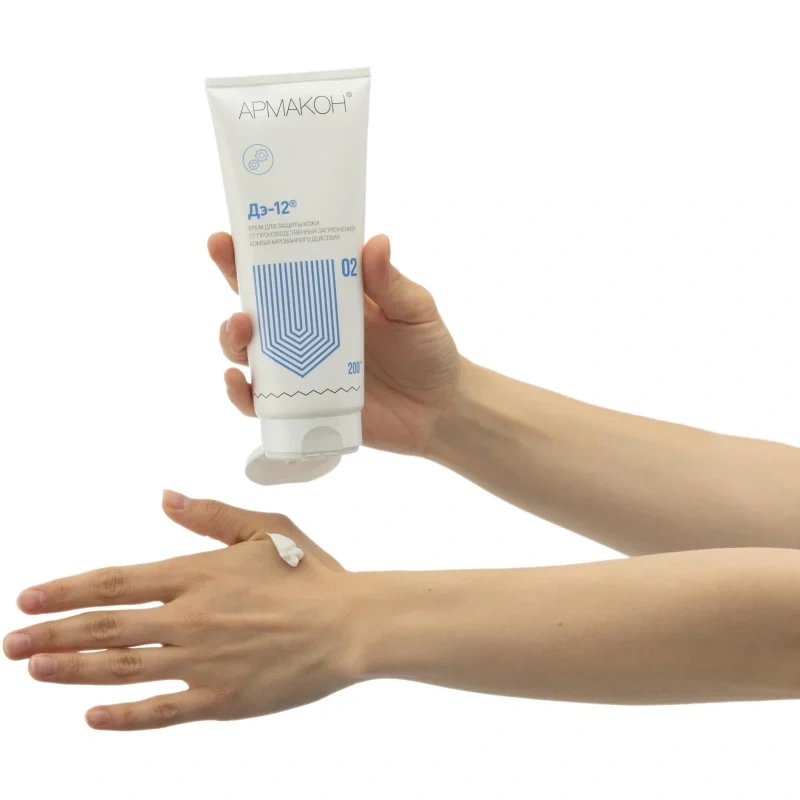 Универсальный защитный крем Армакон Дэ-12 предназначен для защиты кожи от нефтепродуктов, красок, растворов цемента, кислот, щелочей. Защитный крем комбинированного действия предназначен для защиты кожи при попеременном воздействии водорастворимых (водных растворов кислот, щелочей, извести, цемента, дезинфицирующих средств, удобрений) и водонерастворимых (растворителей, технических масел, красок, нефтепродуктов) материалов и веществ. Образует на коже прочную газопроницаемую защитную пленку. Специально подобранная сбалансированная комбинация компонентов (акрилат сополимер, тальк, жидкий парафин, петролатум) препятствует проникновению загрязнителей к поверхности кожи. Содержит инактивары, нейтрализующие вредное воздействие солей тяжелых металлов и химических раздражителей. Формула крема включает и дополнительный уход за кожей: глицерин аккумулирует влагу из воздуха и насыщает ею кожу; аллантоин — противовоспалительное и антибактериальное вещество, препятствует закупориванию пор. Гипоаллергенный: максимально снижен риск возникновения аллергических реакций. Подтверждено клинически. Использование защитного крема направлено на предотвращение возникновения профессиональных дерматитов и снижение затрат на их лечение. Быстро впитывается, оказывает увлажняющее действие на кожу, облегчает последующий процесс очищения. Защитная способность подтверждена результатами научных исследований. Не содержит красителей, силиконов, парабенов, формальдегид-производных. Соответствует стандартам ТР ТС 019/2011, ГОСТ 31460-2012. Упаковка: туба 200 мл. Срок годности от даты изготовления 24 месяца.