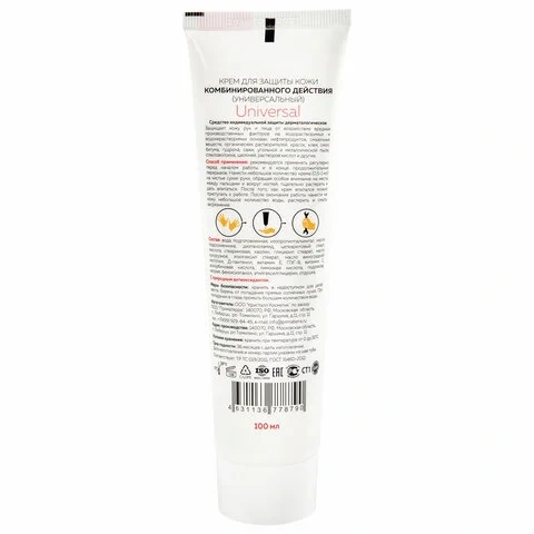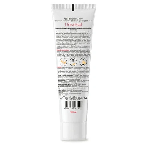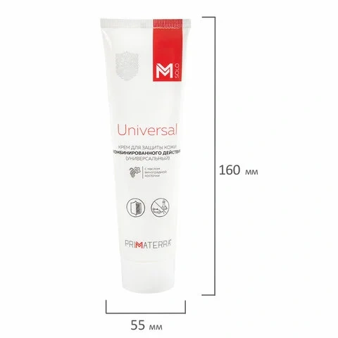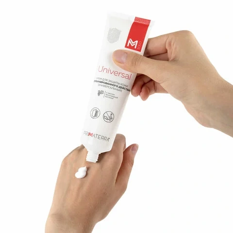 Крем защитный М Solo Universal для рук защищает во время работ при переменном воздействии водорастворимых (различные водные растворы кислот, щелочей, солей, синтетических моющих и дезинфицирующих средств, органических спиртов, смазочно-охлаждающих и тормозных жидкостей, цемента, бетона, глины, извести, тосола, фенола, щелочно-масляных эмульсий) и водонерастворимых веществ (нефть, керосин, бензин, дизельное топливо, мазут, битум, жир, графит, металлическая пыль, органические растворители, СОЖ, масла минеральные нефтяные, лаки, краски, клеи, смолы, зола, сажа и другое). Содержит компоненты (масло виноградной косточки, D-пантенол и витамин E), которые защищают, смягчают и увлажняют кожу рук не нарушая ее физиологических функций. Легко наносится на кожу, не создает неудобства при работе, после работы легко смывается. Не вызывает коррозии на металлических деталях, не портит обрабатываемые изделия и материалы.