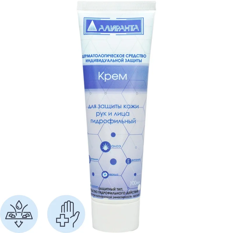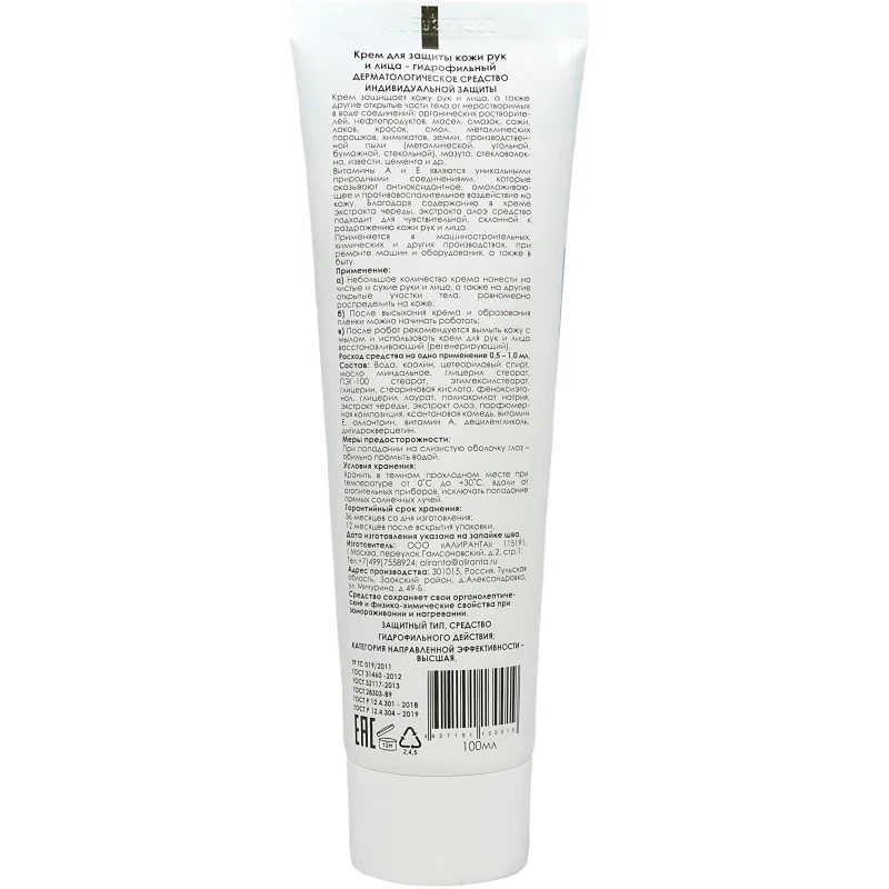 Крем Алиранта защитный гидрофильный для руки и лица 100мл. Назначение: крем защищает кожу рук и лица, а также другие открытые части тела от нерастворимых в воде соединений: органических растворителей, нефтепродуктов, масел, смазок, сажи, лаков, красок, смол, металлических порошков, химикатов, смол, земли, производственной пыли ( металлической, угольной, бумажной, стекольной), мазута, стекловолокна, извести, цемента и др. Область применения: применяется в машиностроительных, химических и других производствах, при ремонте машин и оборудования, а также в быту. Свойства: защищает кожу в течение 4-х часов и более. Облегчает очистку кожи после работы. Быстро впитывается и не оставляет жирных следов и ощущения липкости. Витамины А и Е являются уникальными природными соединениями, которые оказывают антиоксидантное, омолаживающее и противовоспалительное воздействие на кожу. Благодаря содержанию в креме экстракта череды, экстракта алоэ средство подходит для чувствительной и раздраженной кожи рук и лица. Рекомендации по применению: 1. небольшое количество крема нанести на чистые и сухие руки и лицо, а также на другие открытые участки тела, равномерно распределить на коже; 2. после высыхания крема и образования пленки можно начинать работать; 3. по окончании работ вымыть кожу с мылом; 4. после работ рекомендуется использовать крем для кожи рук и лица восстанавливающий (регенерирующий). Расход средства на одно применение 0.5-1мл. Меры предосторожности: при попадании на слизистую оболочку глаз — обильно промыть водой.Упаковка: пластиковые тубы 100 мл. Условия хранения: хранить в темном прохладном месте при температуре от 0 до +30°С. Гарантийный срок хранения: 36 месяцев со дня изготовления, 12 месяцев после вскрытия упаковки. Объем — 100 мл. Соответствует стандартам ГОСТ 31460-2012, ГОСТ Р 12.4.301-2018, ТР ТС 019/2011.