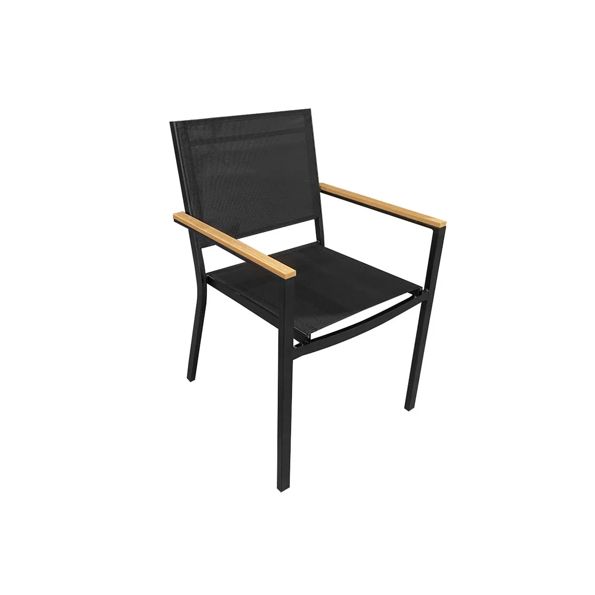Штабелируемое кресло из высококачественного текстилена темно- серого цвета. Устойчивый прочный каркас из нержавеющего металла с порошковым покрытием цвета антрацит. Современный и лаконичный дизайн. Прочные и практичные материалы позволяют эксплуатировать кресло в течение всего года на открытом воздухе. Подлокотники выполнены из искусственного дерева.