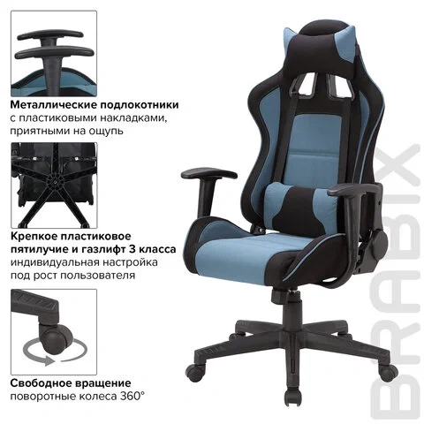 Кресло геймера Brabix GT Racer GM-100 ткань, черно-голубая, две подушки, крестовина пластик