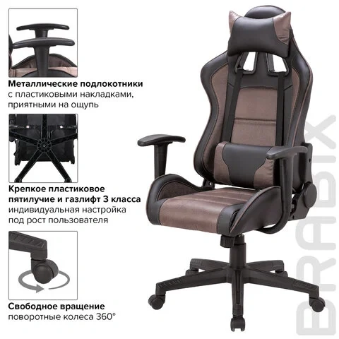 Кресло геймера Brabix GT Racer GM-100 ткань, черно-коричневая, две подушки, крестовина пластик