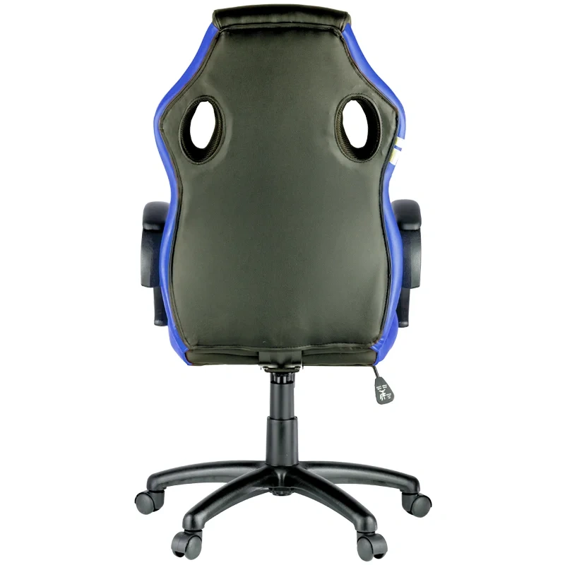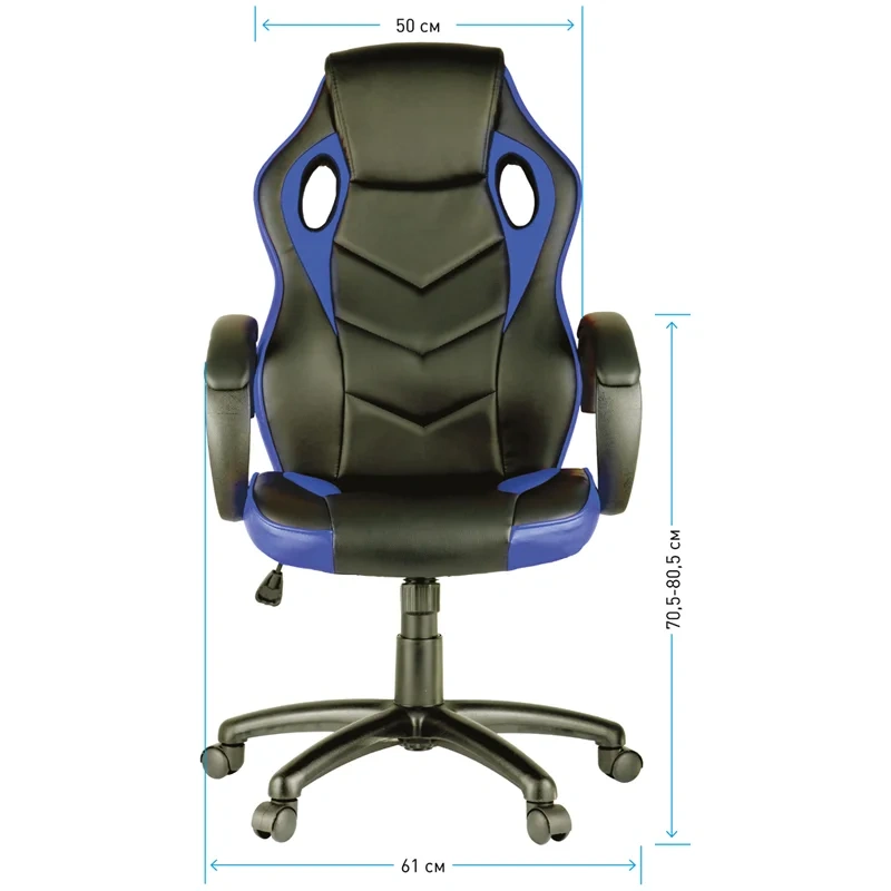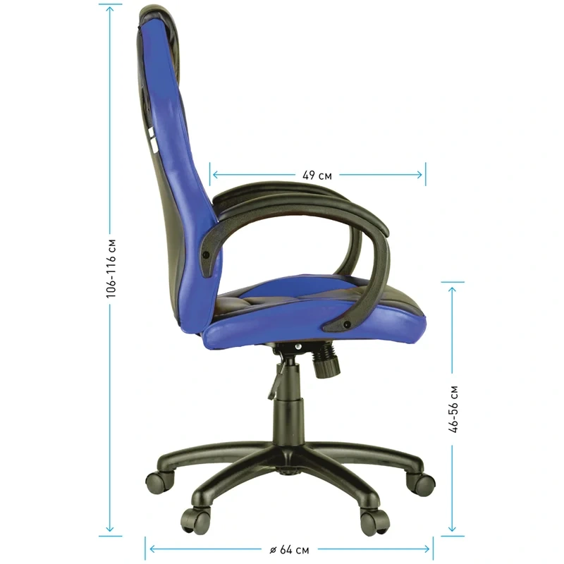 Максимальная нагрузка составляет 120 кг. Газпатрон 2 класса по стандарту BIFMA X5.1. Каркас – немонолитный, материал набивки – вспененный полиуретан, крестовина – пластик, материал подлокотников – пластик с накладками из экокожи, материал обивки – экокожа чёрного и синего цветов. Механизм качания с возможностью фиксации кресла в рабочем положении. Гарантийный срок – 12 месяцев.