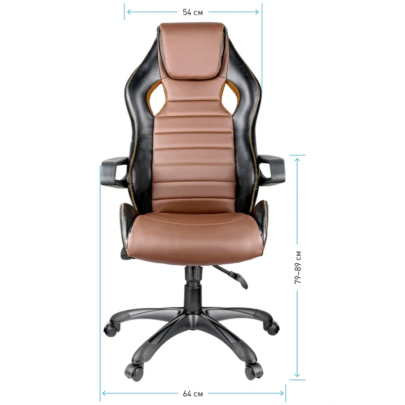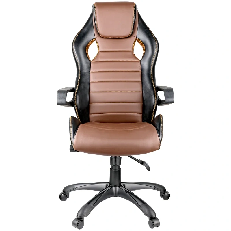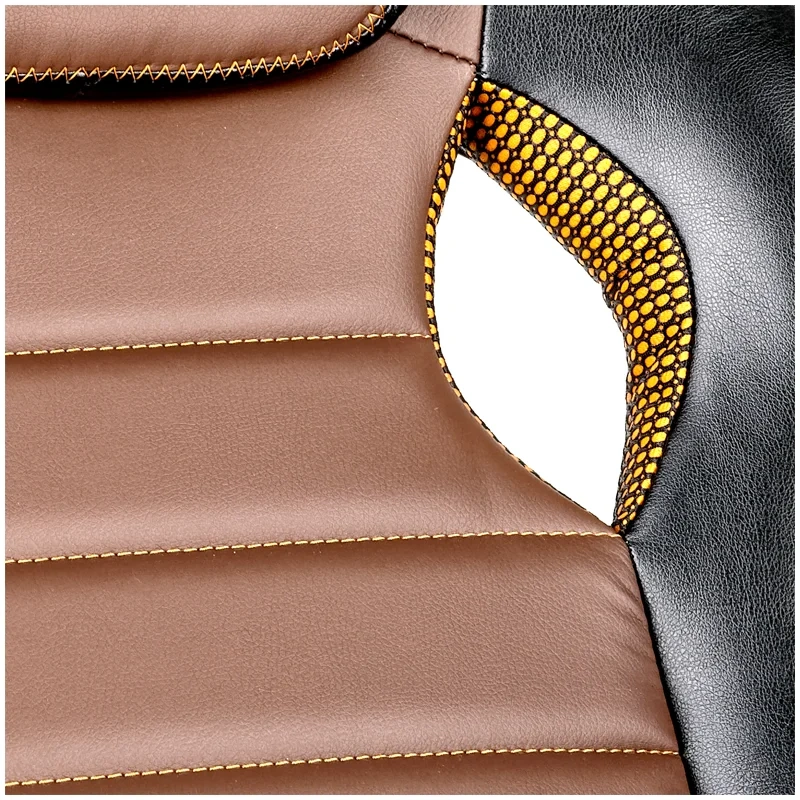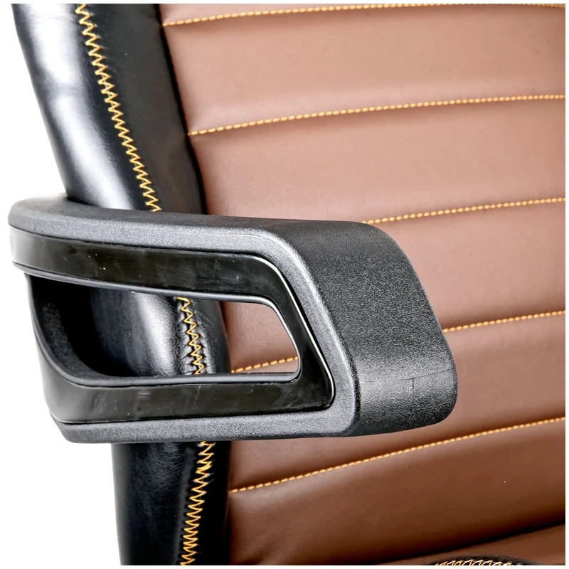 Каркас – немонолитный, материал набивки – вспененный полиуретан, крестовина – пластик, материал подлокотников – пластик, материал обивки – экокожа чёрного и ткань оранжевого цветов. Механизм качания «Люкс» с возможностью фиксации кресла в нескольких положениях. Гарантийный срок – 12 месяцев.