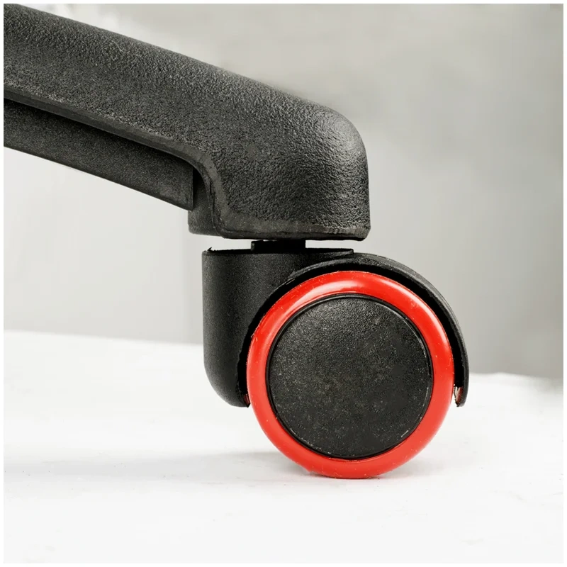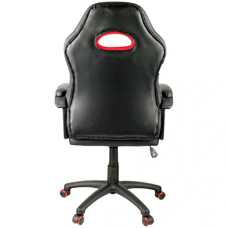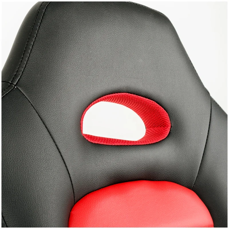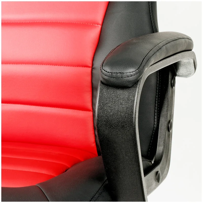 Максимальная нагрузка составляет 120 кг. Газпатрон 2 класса по стандарту BIFMA X5.1. Каркас – немонолитный, материал набивки – вспененный полиуретан, крестовина – пластик, материал подлокотников – пластик с накладками из экокожи, материал обивки – экокожа чёрного и красного цветов. Механизм качания с возможностью фиксации кресла в рабочем положении. Гарантийный срок – 12 месяцев.