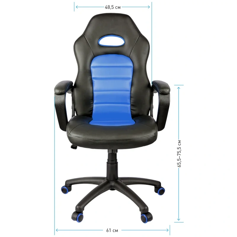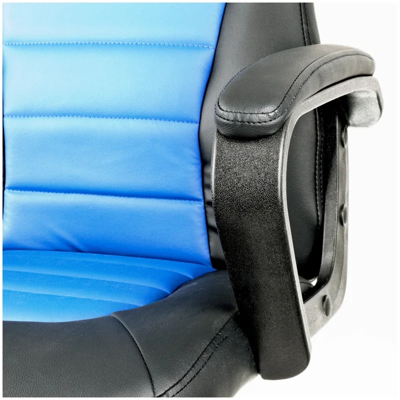 Максимальная нагрузка составляет 120 кг. Газпатрон 2 класса по стандарту BIFMA X5.1. Каркас – немонолитный, материал набивки – вспененный полиуретан, крестовина – пластик, материал подлокотников – пластик с накладками из экокожи, материал обивки – экокожа чёрного и синего цветов. Механизм качания с возможностью фиксации кресла в рабочем положении. Гарантийный срок – 12 месяцев.